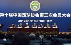 2017.1第十屆中國足球協會第三次會員大會于2017年1月17-18日在湖北省武漢市塔子湖足球訓練基地舉行。大會修訂了《中國足球協會章程》,調整了第十屆中國足球協會執委會部分成員,審議了《2016年中國足球協會工作報告》、《中國足球協會2020行動計劃》、《中國足球改革發展試點工作的建議方案》、《中國足球青訓體系建設“165”行動計劃(審議稿)》等重要文件,聽取了各專項委員會工作報告和2016年中國足協財務審計情況的報告,并舉行了足球界“故人緬懷”儀式和足球事業杰出貢獻獎表彰活動等。