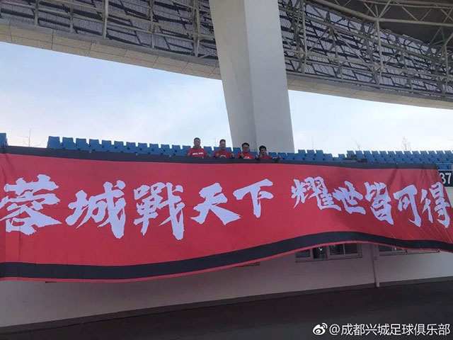 3月16日,中乙第1輪成都興城客場(chǎng)挑戰(zhàn)南京沙葉河海。這四位成都興城球迷,從四川遠(yuǎn)赴江蘇南京,為成都興城將士助威。在掛著的橫幅上寫著:“蓉城戰(zhàn)天下,耀世皆可得”。