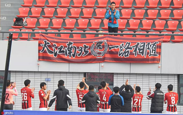 3月23日,中乙第2輪蘇州東吳客場(chǎng)挑戰(zhàn)武漢三鎮(zhèn)。一個(gè)人遠(yuǎn)征武漢的這位蘇州東吳球迷出現(xiàn)在了看臺(tái)上,在掛著的橫幅上寫著“大江南北,一路相隨”。蘇州東吳的教練和隊(duì)員,來(lái)到看臺(tái)下向這位球迷表示了感謝。