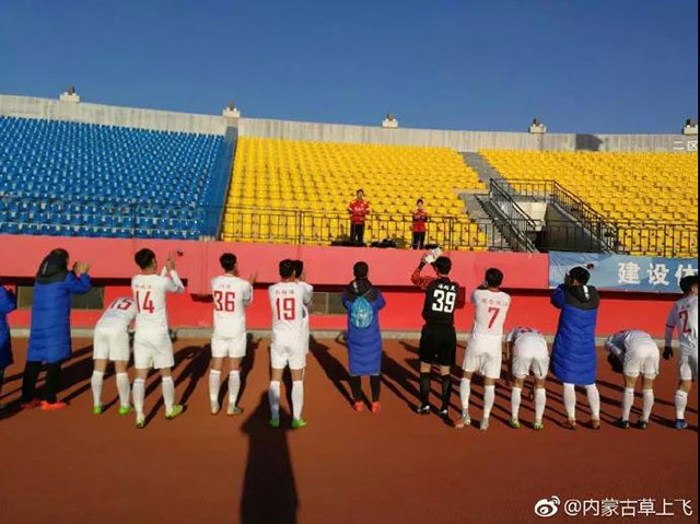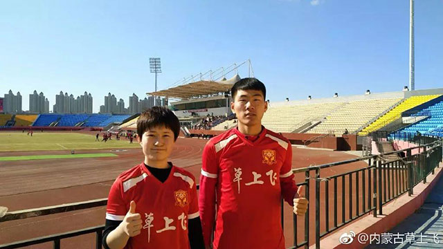 3月23日,中乙第2輪內(nèi)蒙古草上飛客場(chǎng)挑戰(zhàn)沈陽(yáng)城市建設(shè)。在客隊(duì)球迷看臺(tái),出現(xiàn)了身穿內(nèi)蒙古草上飛球衣的兩位球迷,遠(yuǎn)征沈陽(yáng)的他倆,讓內(nèi)蒙古草上飛教練與球員大為感動(dòng)。