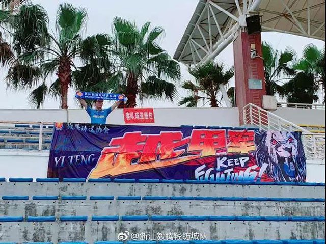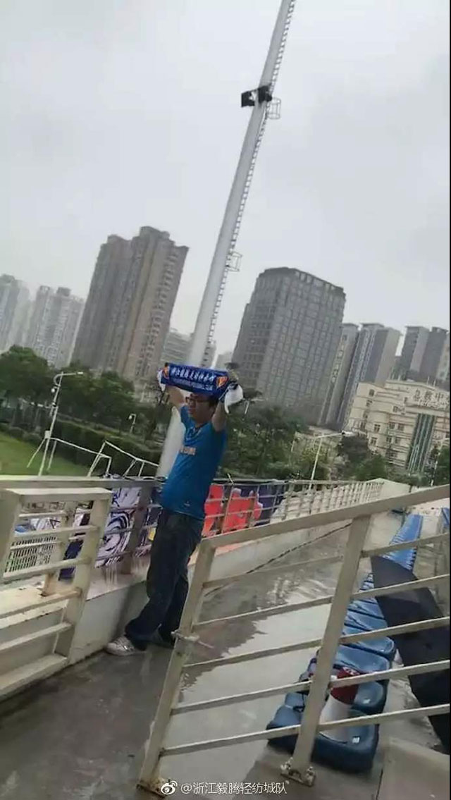 4月14日,中乙第5輪浙江毅騰客場(chǎng)挑戰(zhàn)深圳鵬城。這場(chǎng)比賽在大雨中進(jìn)行,在客隊(duì)球迷看臺(tái),這位遠(yuǎn)征的球迷在雨中高舉浙江毅騰的圍巾,一個(gè)人在看臺(tái)上戰(zhàn)斗,全身早已被雨淋濕。