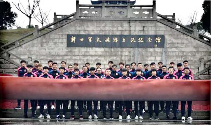 2019年3月5日,沖山——新四軍太湖游擊隊(duì)紀(jì)念館,蘇州東吳賽前出征儀式上,總經(jīng)理邱源將隊(duì)旗交到了隊(duì)長(zhǎng)胡鳴飛的手中。